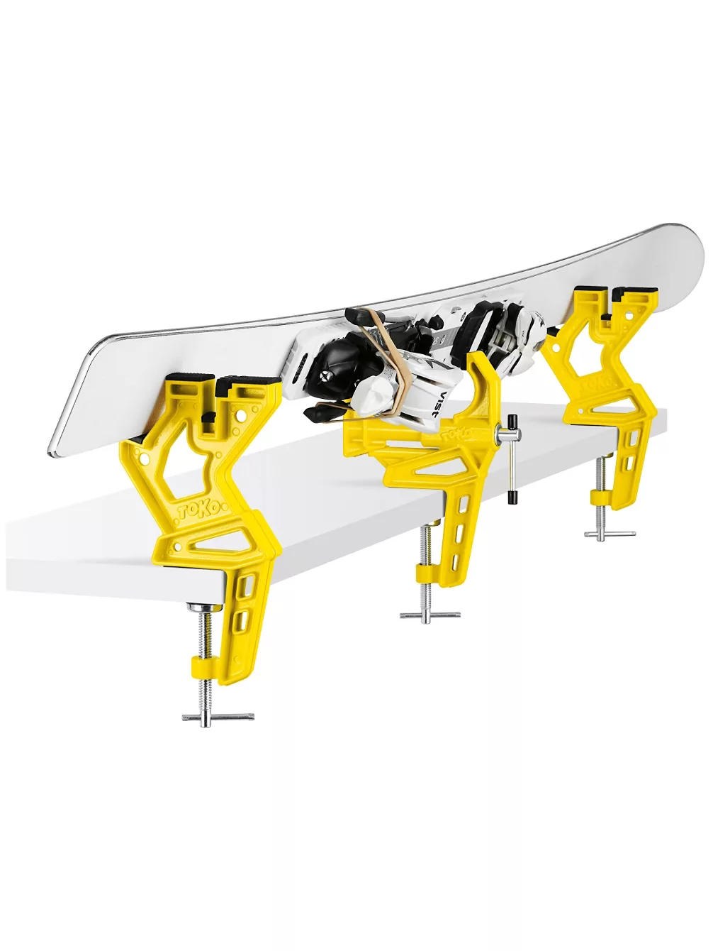 Mit dieser 3-teiligen Einspannvorrichtung lassen sich über die Klemmbacken auch extrabreite Freeride-Ski an der Bindung sicher fixieren. Für die Kantenpräparation kann der Ski neben der normalen 90° Position auch in einer schrägen 60° Position fixiert werden. Die robuste mittlere Klemmvorrichtung öffnet bis 90 mm.